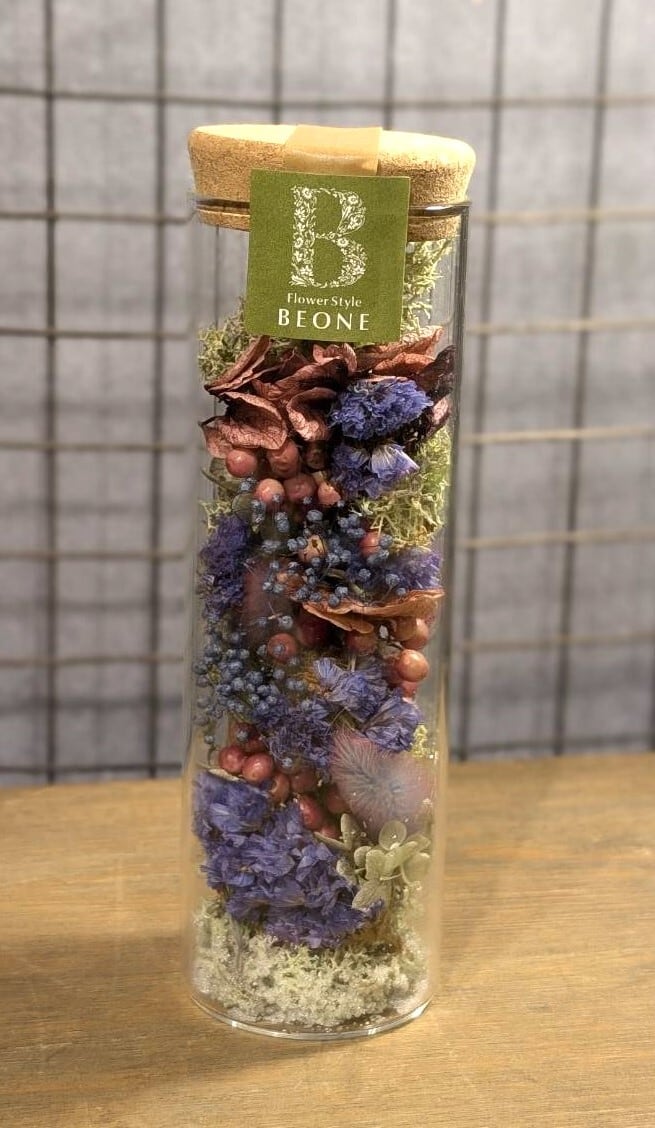 Flower Style BEONE オリジナルのボトルフラワーです。プリザーブドフラワーやドライフラワー・アートフラワーをぎゅっと詰め込んだ可愛いらしいデザイン。ひとつひとつフローリストが心を込めて丁寧に仕上げています。ギフトラッピングも無料です*